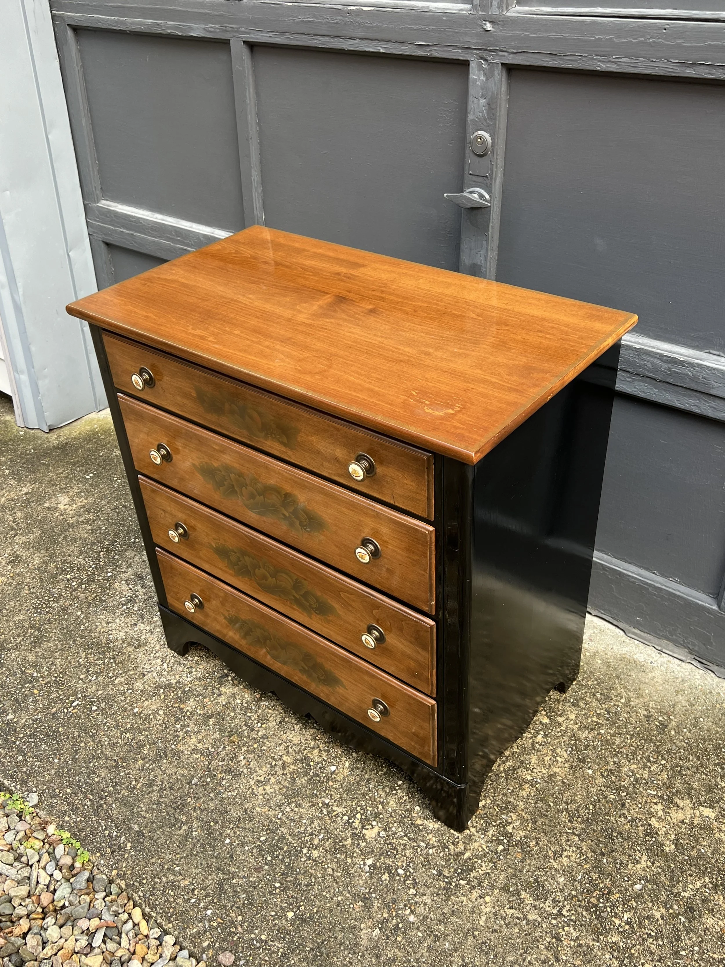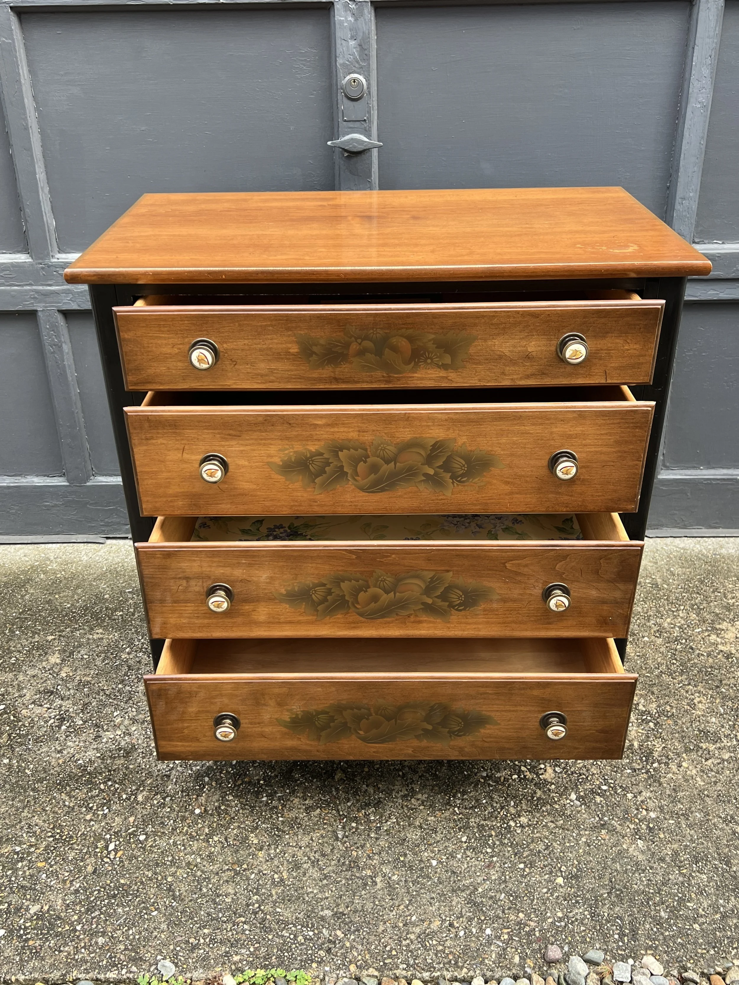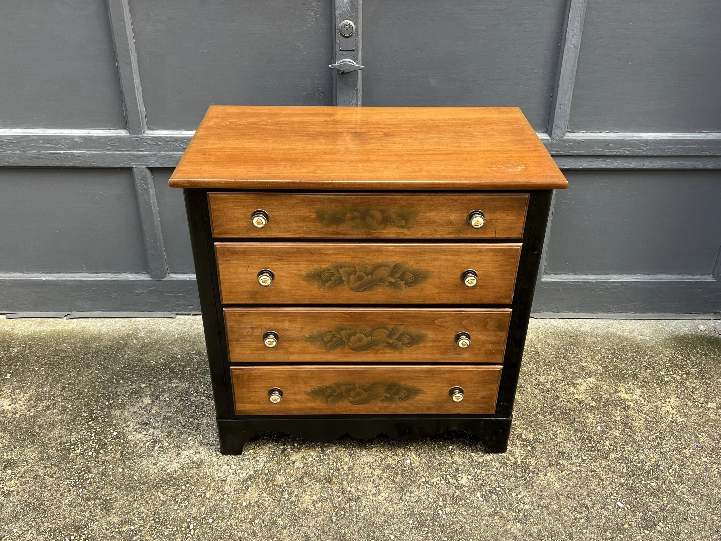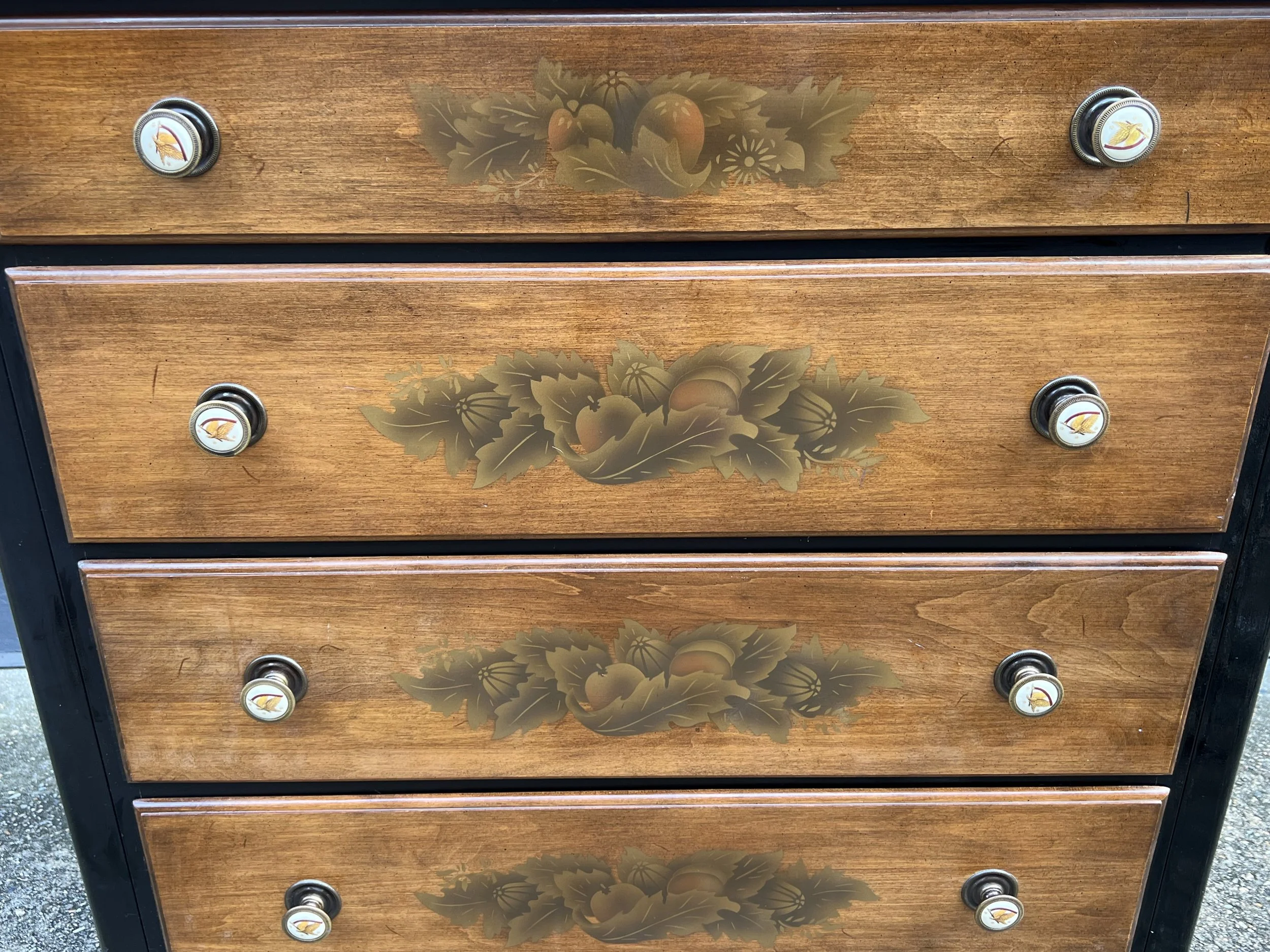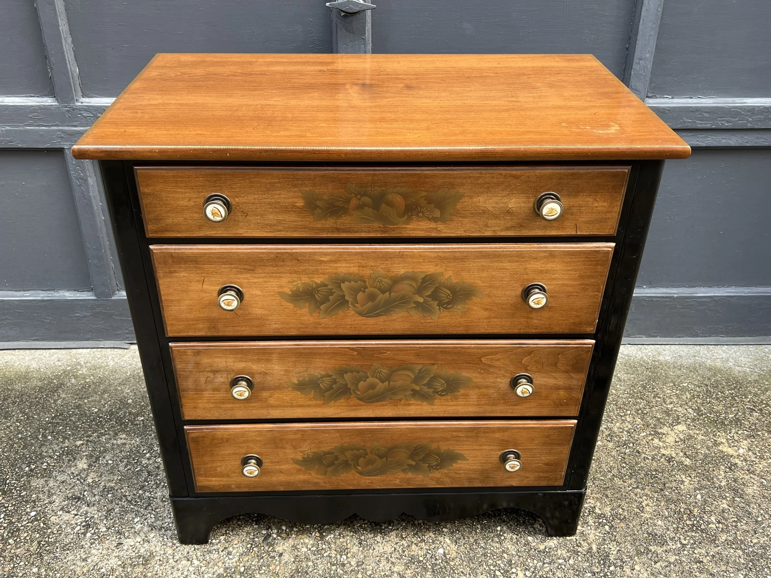 Made of solid maple wood with motif gold floral and fruit stenciling and black accent maple painted wood.